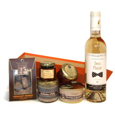 This sweet and savory box is the perfect gift for foodies who appreciate authentic products. Inside, you'll find a refined selection: wild boar terrine with Armagnac, goose rillettes, foie gras, Côtes de Gascogne white wine (37.5 cl), and regional sweets (strawberry candy dessert, Muscatine chocolate). A rich and varied assortment.