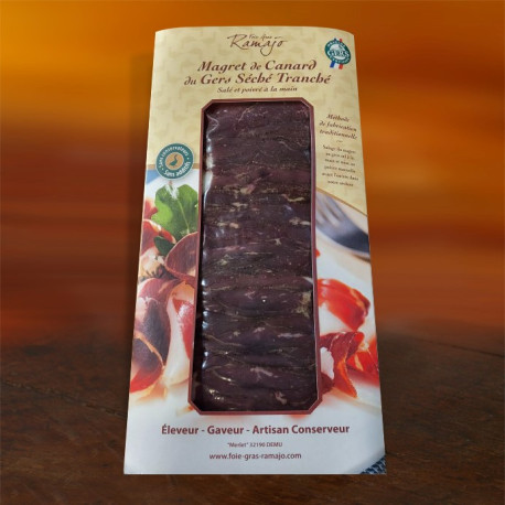 Sliced dried duck breast certified IGP Gers. Simply seasoned with salt and pepper, then thinly sliced for immediate enjoyment. Vacuum-packed 120 g package. Ideal as an appetizer, in salads, or on a charcuterie platter.