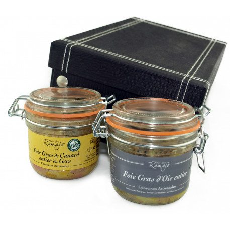 El Duo Gascon es un magnífico estuche de prestigio que presenta las dos joyas culinarias de nuestra región de Gers: el foie gras de oca y el foie gras de pato.