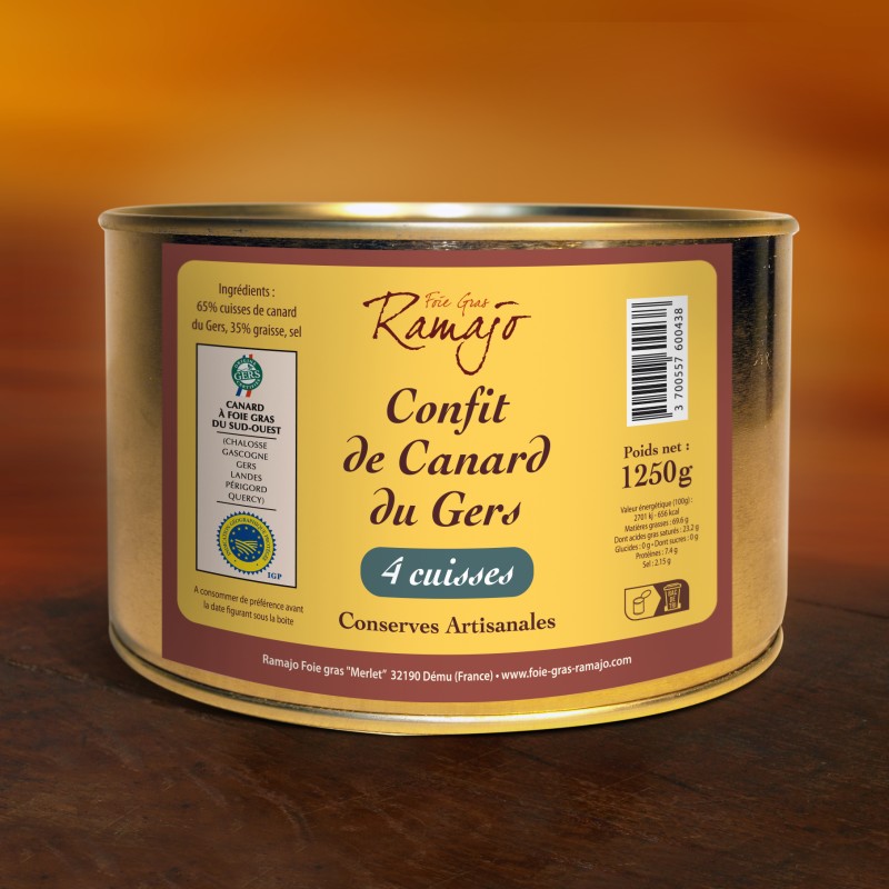 Ingrédients : 65 % cuisses de canard du Gers, 35 % graisse, sel
